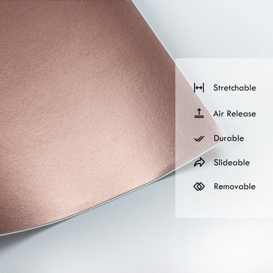 The matte metallic rose gold vinyl wrap is engineered to make installation as simple and clean as possible. Thanks to its air-release channels and moderate stretch, this wrap can be smoothly applied over both flat panels and curved surfaces.